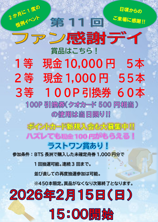 【2月15日(日)】第11回ファン感謝デイ ガラポン抽選会